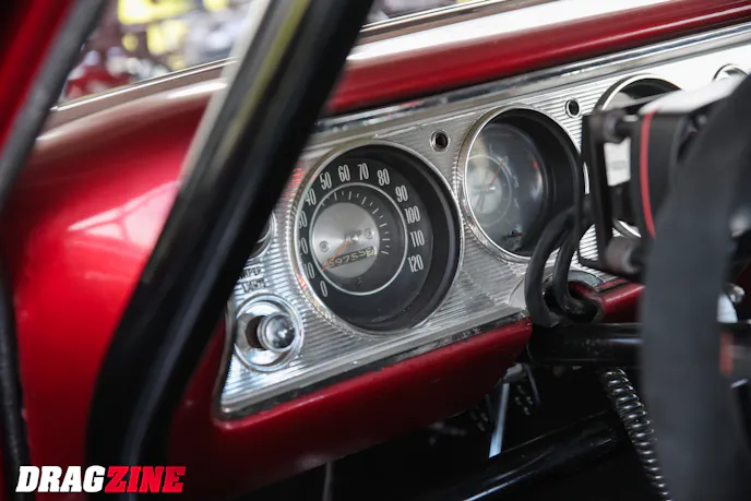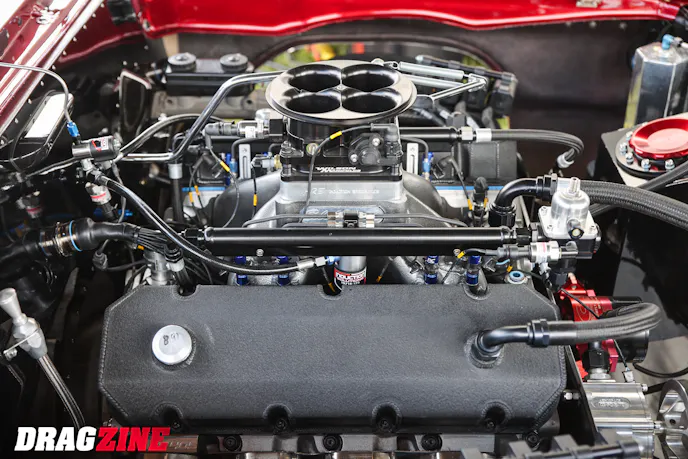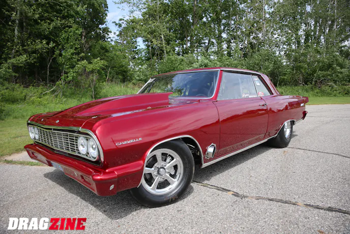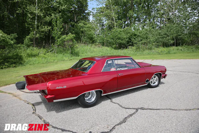 Backing the motor is a Proformance-built TH400 with a Bradco converter, Wiles carbon-fiber driveshaft, and a fabricated 9-inch rearend stuffed with Strange gears and Moser axles. Menscer Motorsports shocks front and rear, along with ladder bars, TRZ control arms, and AFCO springs keep the car planted. Aerospace brakes bring it down from those 150 mph charges, while Weld rears wrapped in Mickey Thompson ET Street R tires do the dirty work. On the outside, it still looks like a largely stock Chevelle; it’s finished in Ruby Red, capped with a Glasstek hood and a Mike Miller spoiler. But under the flanks, it’s a serious, purpose-built race car with a 25.5-cert cage, Stroud safety gear, and wiring by longtime friend Houston Gentry.