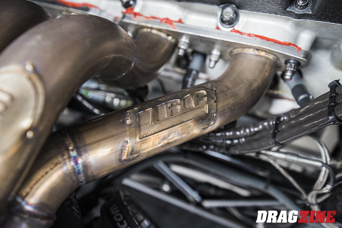 Exhaust exits through headers fabricated from Stainless Works materials, and a removable Be Cool radiator and fans by GC Cooling Fans help cool the hard-working engine in the car, which has two fuel tanks, including one for the alcohol Lutz burns on the strip, and another for the gas he burns on the street.