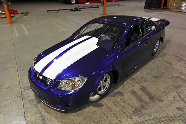 The Joneses recently purchased this beautiful Chevrolet Cobalt, built by B&B Race Cars in Tennessee to campaign in the Outlaw True 10.5/Outlaw Drag Radial ranks this season following an unfortunate crash early last season ar the Huntsville Dragway with their Limited Street Mustang. B&B is one of the premier builders in the country of such rear wheel drive conversion cars, and this is one of the finest examples of such a race car. The Cobalt features a 25.3 spec cage and chassis with an all-carbon fiber interior, Mark Williams brakes on all four corners, Santhuff shocks and struts, and plenty of other top shelf parts.