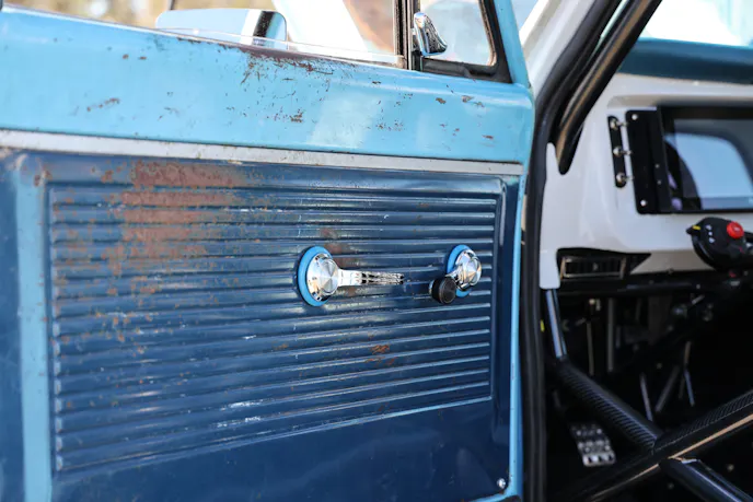 Crampton and his speed shop built the C10’s chassis out of chrome-moly to a 6.0, 25.3 SFI certification. It was powdercoated in gray before the body was dropped back on it. Tony Pedregon, the former NHRA Funny Car driver and two-time champion, painted the interior the bright and glossy blue hue, and back home, Clift had good friend Mitch Kim lay down the pinstriping and lettering.