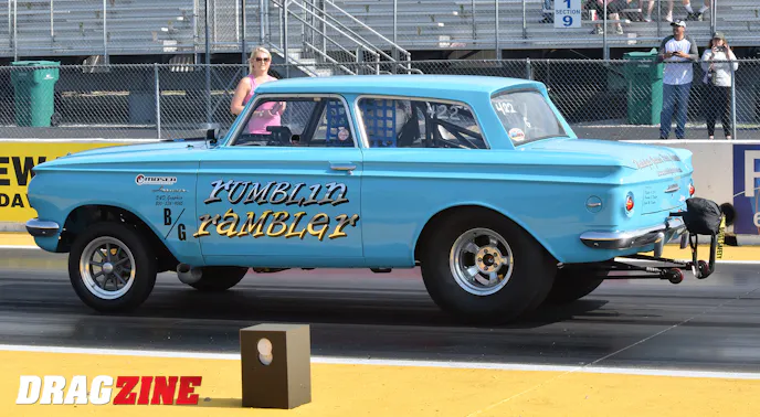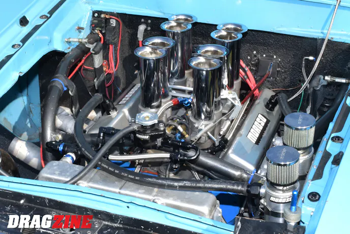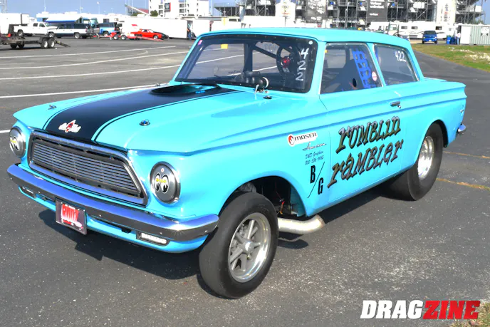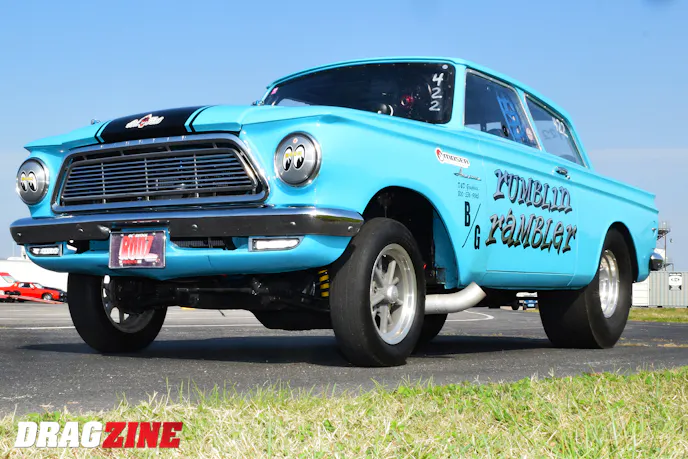 The Rambler rolls with Mickey Thompson 33×10.5 slicks on Halibrand wheels on the rear, and Rocket Racing spoke wheels out front. Unique to the Gasser is a Mustang II front suspension layout using custom A-arms and 11-inch springs to give the Rambler the “high-up” front stance.
