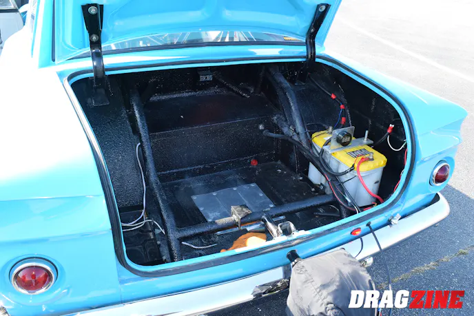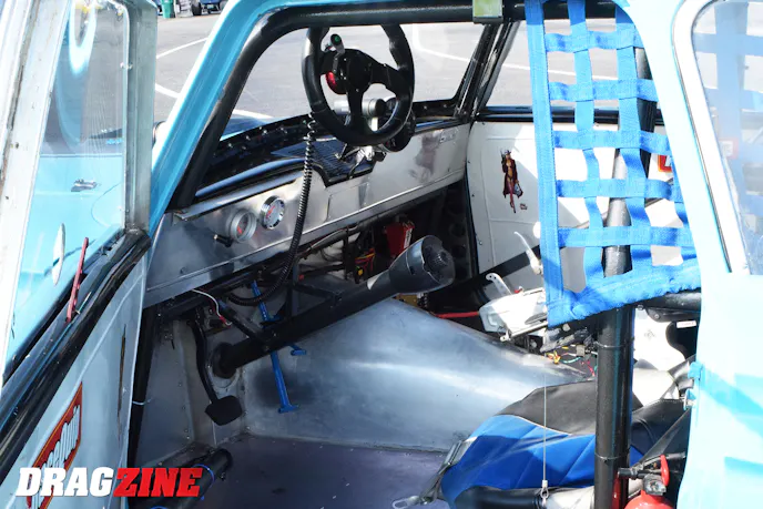 The body is original American Motors steel other than the fiberglass hood and Lexan windows. Other hardware on the inside of the Gasser includes Autometer gauges and a B&M Racing Quarter Stick shifter.