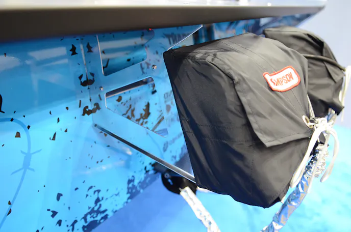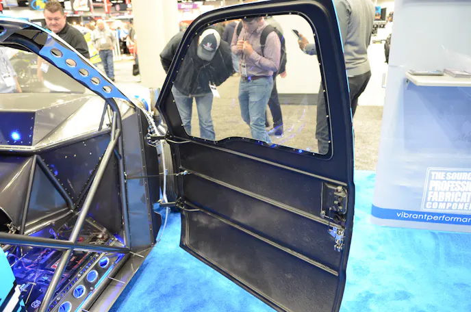 As you can see in the images — and part of the reason, beyond its physical size, that it got so much foot traffic and views at PRI — is the degree of chrome and polishing instituted in the truck, along with its eye-catching wrap theme and the interior, with blue LED lights, a custom plexiglass cover for the electronics, the Racepak Dash, and the hefty helping of carbon fiber.