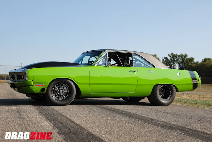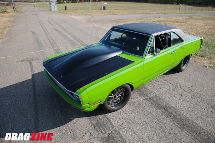 The supporting driveline components are as serious as the engine. A TH400 reverse manual transmission from RPM Transmissions puts the power down through a carbon-fiber PST driveshaft to a 9-inch Ford rearend stuffed with Moser 40-spline axles and a spool. Menscer Motorsports shocks keep the Dart planted, and a set of TBM brakes bring it to a stop after each pass. The dart sports a set of Mickey Thompson drag radials out back for maximum traction.
