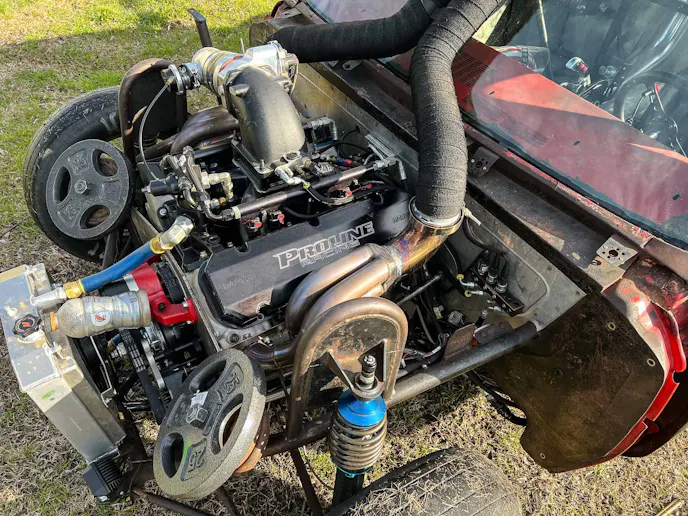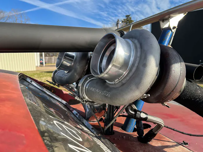The switch to the big-block, despite the power gains it presented, also brought about a dramatic shift in weight bias, leading to traction issues and unwelcome wheelies. Their solution? Relocate the turbos. In a move that defies convention and has already turned heads despite only being tested privately, the team mounted the twin VS Racing 80/104.5 turbos above the rear decklid, running charge pipes up and over the windshield and down the length of the roof to the turbos. “A lot of people doubted it would spool, but that big-block doesn’t care,” Zach says with a laugh. “It’s all about math and leverage. Getting the weight where we needed it was key.” The car was already unconventional enough with a dragster-style rear wing, but this was over-the-top —literally.