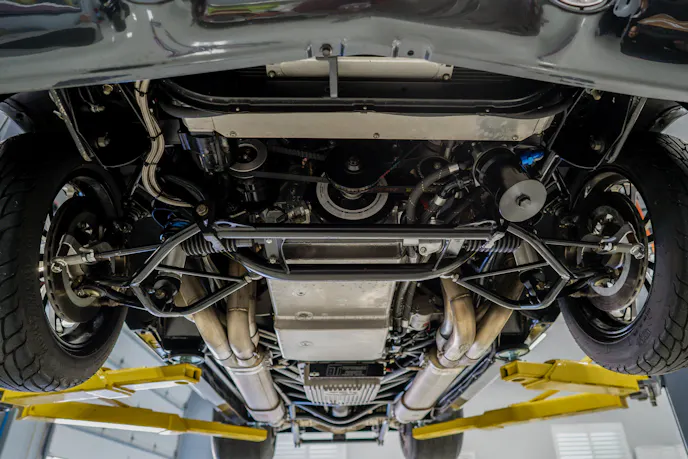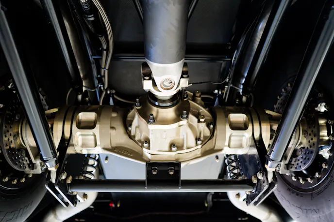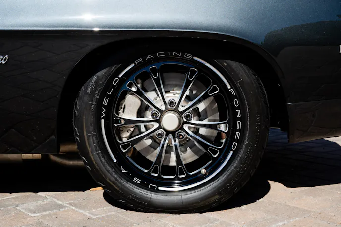 The chassis was built by Rick Stevens Race Cars and features a raised floor to accommodate a full-length, 6-inch oval to 4-inch round street exhaust for comfortable cruising, as well as mammoth carbon-fiber wheel tubs to put some big slicks on if you feel so inclined. The chassis, which has been equipped with Menscer Motorsports shocks at all four corners, also features a Smith Racecraft tubular front end with a manual rack and pinion steering setup and the four-link rear suspension suspends a Mark Williams full-floater rearend with 40-spline axles and a 3.89:1, 10-inch gear set.