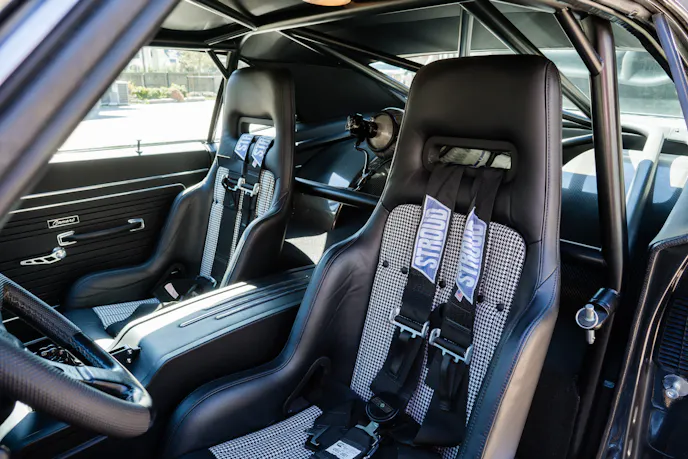 The full interior is well equipped with houndstooth-covered Kirkey racing seats, a custom center console, leather-trimmed dash, title steering column, full instrumentation as well as the FuelTech FT600 ECU display, and an 8.50-cert roll cage with swing-out door bars.