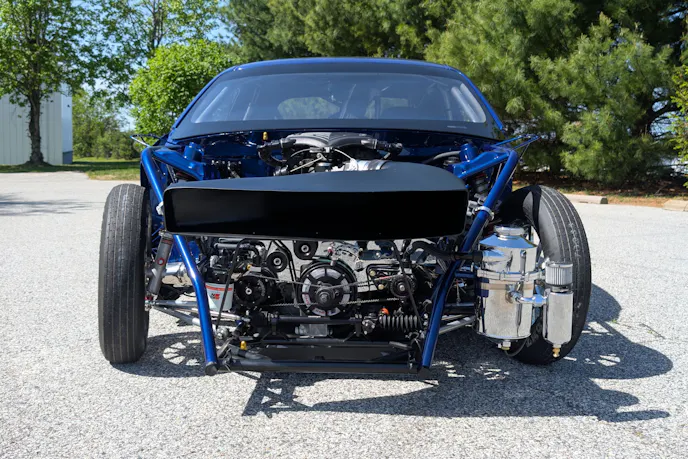 Rohe redid the rear of the car, incorporating a custom four-link suspension, and Strange Engineering full-floater for maximum strength and safety. A spindle-mount front suspension was added, while weight was removed from every possible area, and a set of custom-fabricated headers were installed.