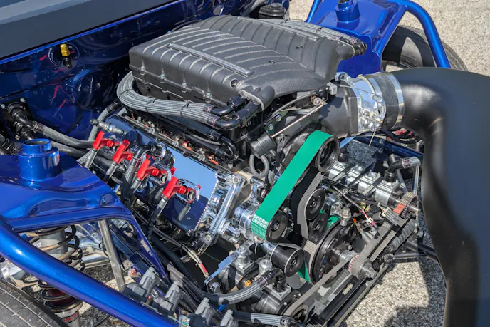 The high-flowing aluminum Thitek cylinder heads were completed with a valvetrain consisting of Jesel rockers and solid lifters, actuated by a solid roller COMP cam. “It’s also got a Moroso oil pump, vacuum pump, and valve covers, along with a custom HHP 3/4” billet motor plate for the Whipple,” added Maichle, the mastermind responsible for fabricating and installing all the goodies. The hoses and fittings came from Brown & Miller Racing Solutions. “It also has a custom ram air inlet made by Modern Street Customs and Mike Kostic.”