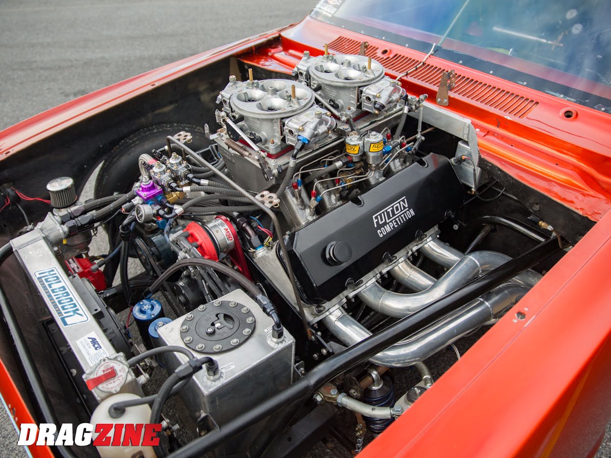 To continue his class racing journey in Outlaw 632, Brian wanted to make sure he had plenty of power under the hood. Fulton Competition Race Engines got the call to build a stout engine filled with great parts from Gibtech and GRP. Dart Big Chief heads that got a full massage from Fulton were bolted to the short block. A custom Fulton intake manifold that features a Fulton-plumbed nitrous system work with a pair of CFM carburetors to bring, air, fuel, and nitrous into the engine. The task of sending the nitrous-fed power to the rear tires is handled by a JCR-built turboglide and Cameron’s Torque Converter Services converter.