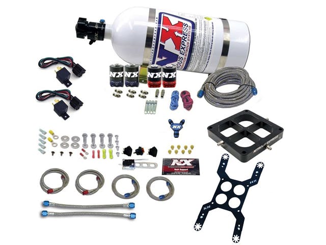 The new NX Billet Crossbar nitrous plate systems from Nitrous Express have just raised the bar in nitrous plate technology. The CNC machined design eliminates round spray bars resulting in excellent atomization and cylinder distribution. With no spray bars to sag, rotate or disrupt airflow, this is truly the Next Generation in cross-bar nitrous plate technology. This crossbar nitrous system includes a custom solenoid bracket, billet aluminum y-fittings, braided stainless solenoid to plate lines, nickel-plated fittings, wide open throttle switch, master arming switch, 40-amp relay and relay harness.
