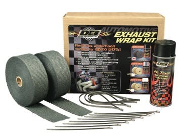 An important first step in reducing unwanted and power-robbing under hood heat is wrapping exhaust headers and downpipes. Less under hood radiant heat results in a cooler air charge for improved performance. Design Engineering offers an all-in-one kit for wrapping a set of headers or motorcycle pipes. The automotive kit includes (2) 2-inch x 50 ft rolls of exhaust wrap (Motorcycle kit: (2) rolls of 2-inch x 15 ft), one can of HT silicone coating & locking ties. Available in Black wrap with black HT spray, tan wrap with white HT spray, and tan wrap with silver HT spray.