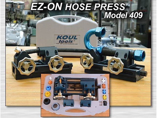 The Koultools EZ-ON Hose Press solves an age old problem. Installing push on fittings has been A nighare to say the least. Boiling water, heat guns etc etc, you can forget about. The New EZ-ON Hose Press will install -4 thru -16 push-on hose onto the fittings in seconds. It is constructed of invesent cast steel. A true piece of machinery. All components are fitted Into custom carrying case for safe storage and transportation. The tool is designed to Install push-on hose onto any angle fitting.