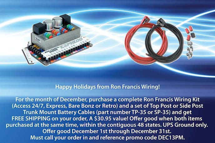 For the month of December, purchase a complete Ron Francis Wiring Kit (Access 24/7, Express, Bare Bonz, or Retro) and a set of top post or side post trunk mount battery cables (part number TP-35 or SP-35) and get free shipping on your order. A $30.95 value. Offer is good when both items are purchased at the same time, within the contiguous 48 states. UPS ground only. Offer is good December 1st through December 31st. You must call your order in and reference promo code DEC13PM.