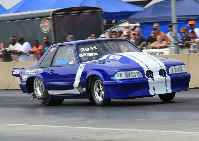 Dave Hance’s 6.106 at 229.55 MPH in testing at the Summit Motorsports Park in Norwalk in Mark Wells’ twin-turbocharged Fox body Ford Mustang — the quickest 1/4-mile pass in history by a legal Outlaw 10.5 car.
