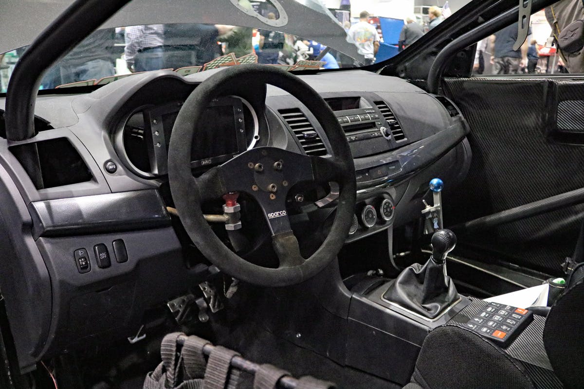 With somewhere around 800 pounds removed from the car [using lots of carbon fiber], this Evo X tips the scales at 2,865 pounds, giving it just shy of 2.4 lbs per horsepower, an impressive benchmark for a platform being pushed into previously uncharted territory.