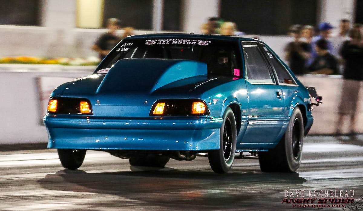 In 2012, to help get the most out of the engine, he added mini-tubs to fit a larger tire out back, added Strange Engineering shocks, and took the car back to Team Z for a 10-point cage. Loose Ends Wiring re-wired the car, adding an MSD Power Grid, and a Racepak V300 and display dash. To put the car on a diet, Hays stripped the car and added a Motor City Solutions hood, front bumper, and doors. At that point he was running 8.90’s, he had graduated college, and was making money. Hays always wanted to run heads-up, and he found a naturally-aspirated class at Milan called All Motor, but after getting his feet wet in the class, he discovered his little 362 cubic inch Ford didn’t really cut it. At one race he was able to qualify number 16, making the cut at the end of 2013.