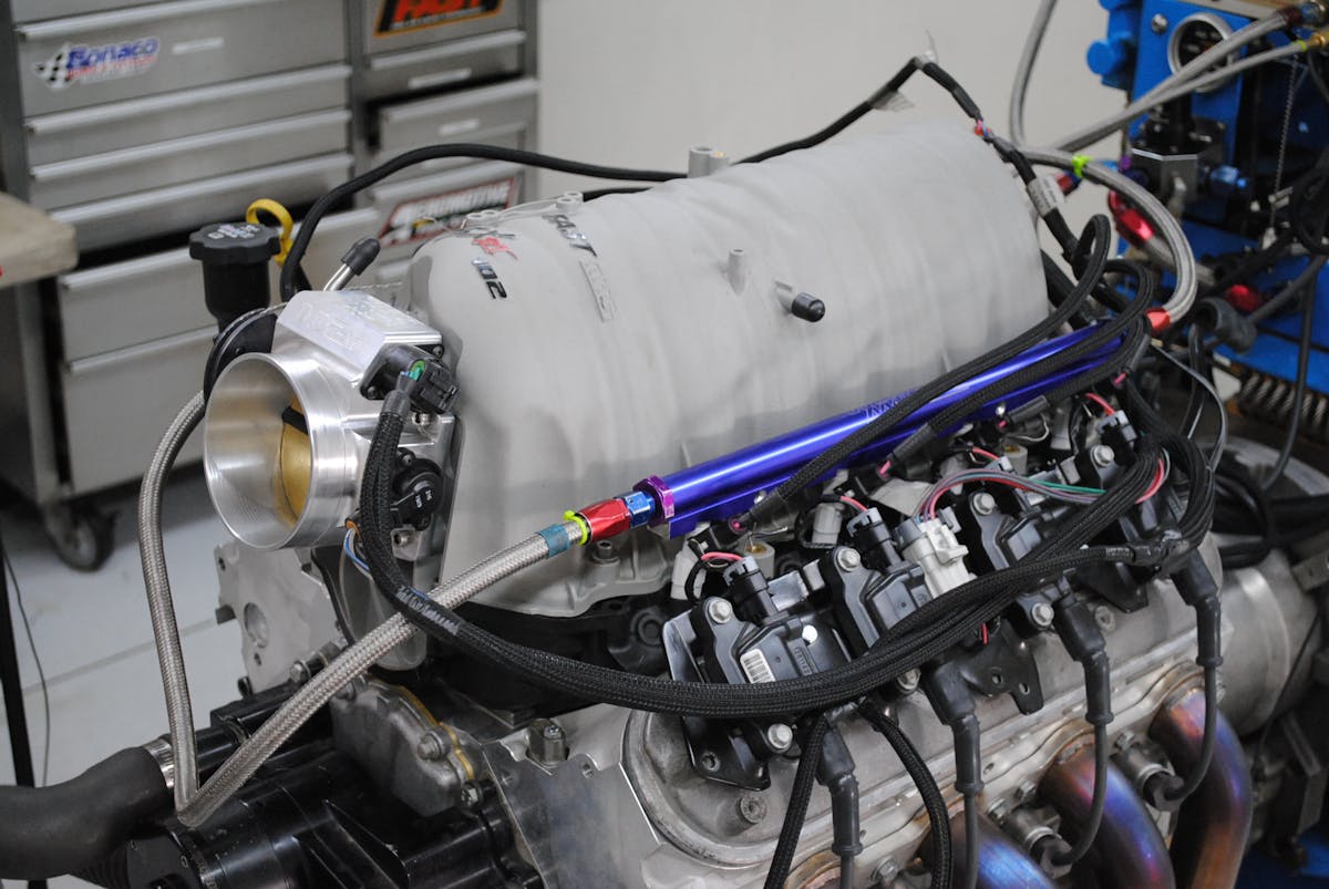 Underneath this stunning fiberglass body sits an original 125-inch Tony Casarez Funny Car chassis originally built in 1985. Again, this chassis has been updated to current specifications but still holds the original Blue Max chassis tag. A 413 cubic inch Brad Anderson powerplant sits between the frame rails with Alan Johnson heads, a single point magneto, 22 gallon fuel pump, Strange 9.5-inch rear end with carbon fiber brakes, a two-speed transmission and Littlefield 6:71 blower peeking through the front of the windshield.