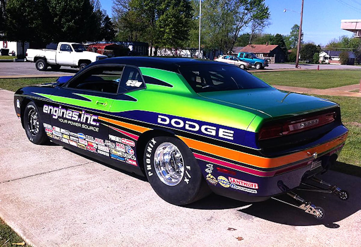 Like the Barracuda, the Challenger sports another eye-catching paint scheme designed by Scott Brown and carrying the namesake of Wofford’s business, Engines Inc., on the door. “The car is absolutely gorgeous,” says Wofford. My wife and younger son helped designed the paint scheme and it’s a little atypical of a Scott Brown design, but it’s just beautiful and I wouldn’t be surprised if it wins a best appearing award.” Power for the new sharp new Challenger will come from a 360 cubic inch, fuel injected HEMI.