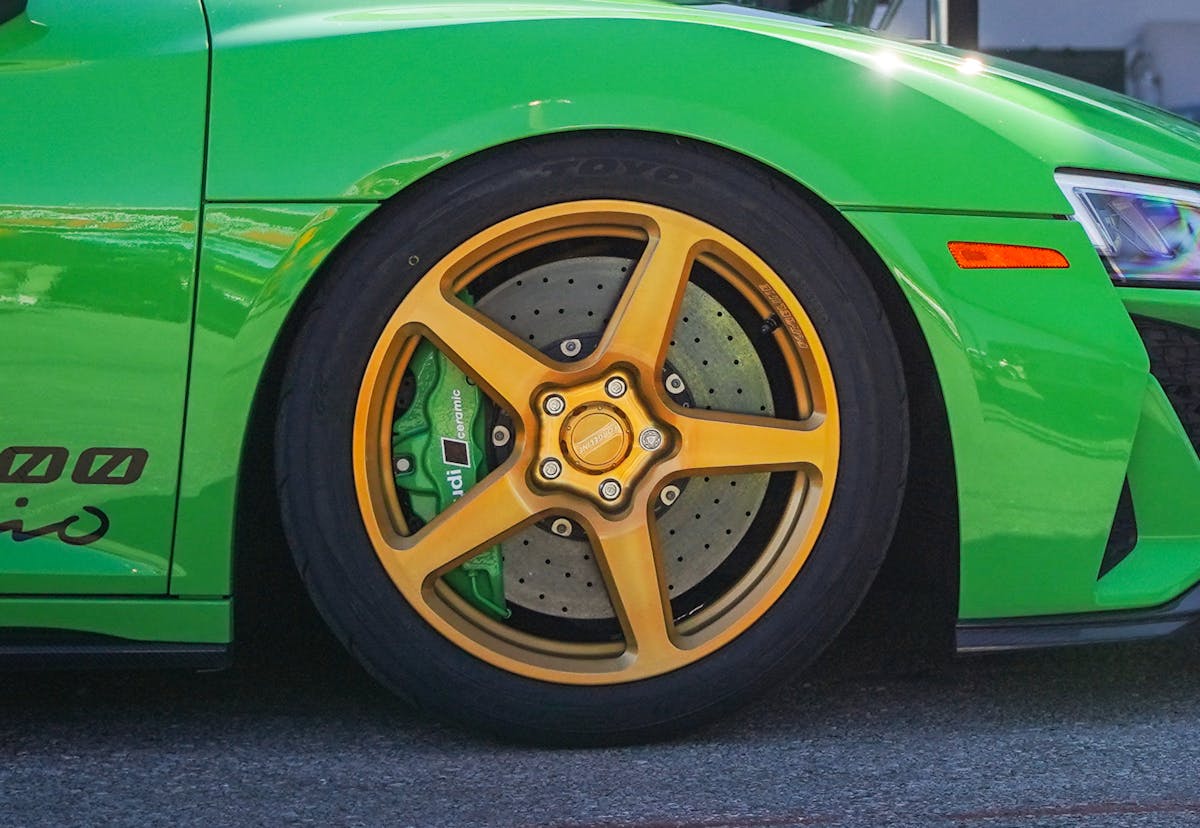Cicio’s 2,400 horsepower Audi R8 shop project is perhaps its greatest test of Forgeline’s drag racing wheels. This green beast is equipped with a 1016 Industries aero kit and the Cicio C1400 package, including the Cicio turbo kit by ETS, MoTec engine management, ETS billet intake manifold, Dodson full transmission build, and Dodson Promax clutch. It rides on Toyo Proxes R888R front tires on 18×8.5-inch Forgeline one-piece forged monoblock CF1 Open Lug wheels out front, and Mickey Thompson ET Street S/S rear tires on 18×12-inch Forgeline forged monoblock CF1R Beadlock wheels finished in transparent gold.