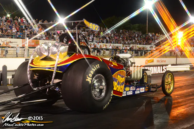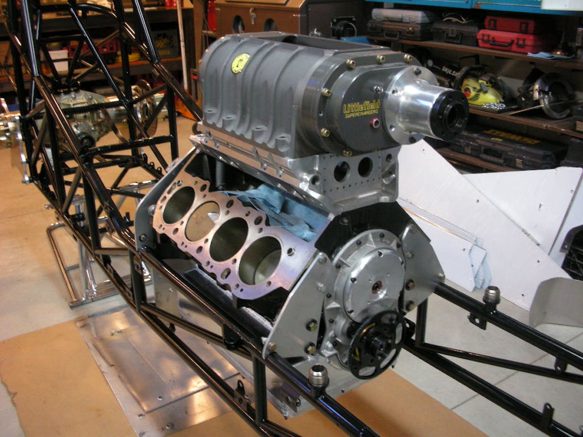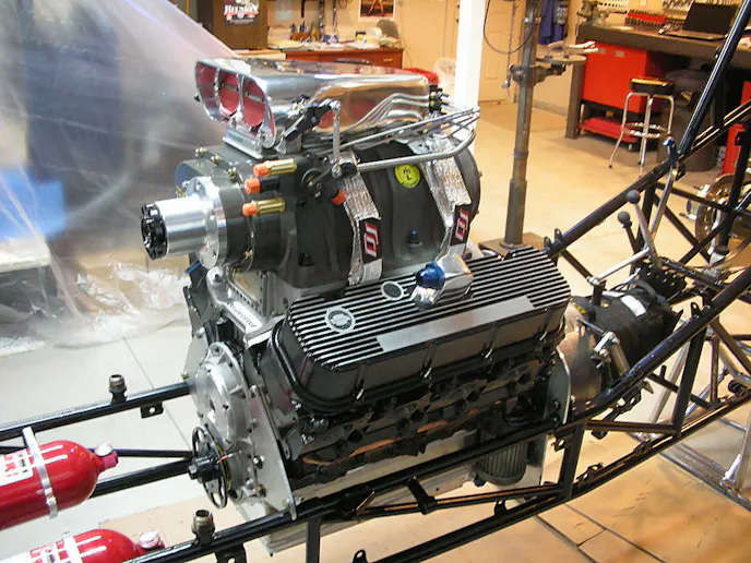 That year, the Jackson Brothers used a stock, tall-deck, 427 cubic inch big block Chevrolet engine block and a stock Chevy 427 forged crankshaft along with Howard rods, Venolia pistons, stock Chevy heads, a Competition Cams camshaft, and Crane push rods and rockers to complete the long block. The intake valves were stock Chevy pieces and the exhaust valves were Donovan Stainless Steel. A Cragar aluminum intake manifold held the Littlefield 6-71 blower and Hilborn four-stack upright injectors in place, while a Mallory Super Mag and related parts ignited the fuel. A Donovan SS exhaust system finished it off.