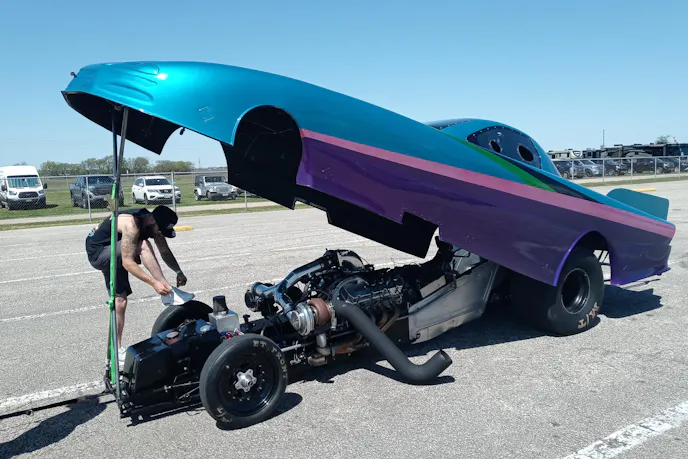 The Funny Car is powered by a 540 cubic-inch big-block Chevy from McCabe Racing Engines that uses a Dart Big M iron block as its base. The top end features a set of Profiler cylinder heads and T&D rocker arms. Boost is funneled into the big Chevy thanks to a set of Stainless Works headers and generated by a par of BorgWarner s475 turbos. A Holley Dominator EFI system controls the 550-pound Precision Turbo & Engine fuel injectors that are fed by the Enderle fuel pump. Transferring the horsepower to the Mark Williams Enterprises rearend is a BTE Powerglide transmission and PTC torque converter.