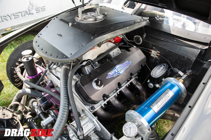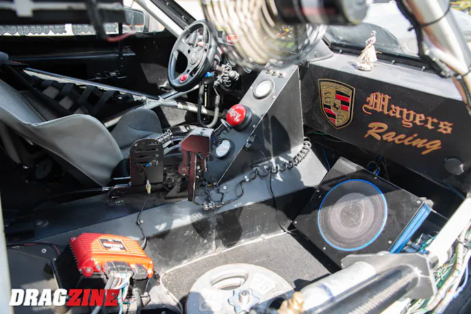The car has gone through a lot of paint changes, engine swaps, and chassis updates while Mayers has campaigned it. Mayers ran the Porsche with the stock front end and suspension for several years, but it was eventually cut off and replaced with a tube-style front end to make maintenance easier. The Porsche is currently powered by a 572 cubic-inch big-block Chevy that was built by Chris Wilson. Bad Habits Transmissions built the Powerglide that rests behind the big Chevy and connects it to the Ford 9-inch rear.