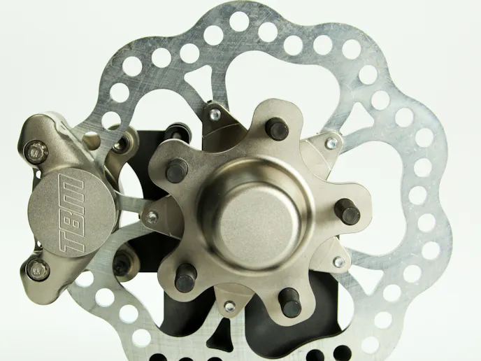TBM’s Revolution rotors still require maintenance like any other brake rotor. To keep them in the best shape possible, scuffing them with 80-grit sandpaper is suggested by TBM. This process is also recommended by TBM if you experience parachute failure and have to really stand on the brakes. A simple inspection for glazing and another scuffing with the 80-grit sandpaper is all that’s needed to repair the rotors after an instance of hard use.As part of the Revolution rotor package, TBM had to design a caliper that would be able to maximize the potential of their rotor. The solution was to create a caliper that was made of chrome-moly in the high-stress areas of the caliper, like the bridges over the rotor, rather than using aluminum in this area. By going with chrome-moly, it allows the caliper to take advantage of the Revolution rotor’s ability to function at high temperatures and not fail. This design also uses forged aluminum outer halves that stiffen the caliper. This allows the caliper to release quicker and have a higher level of clamping force.