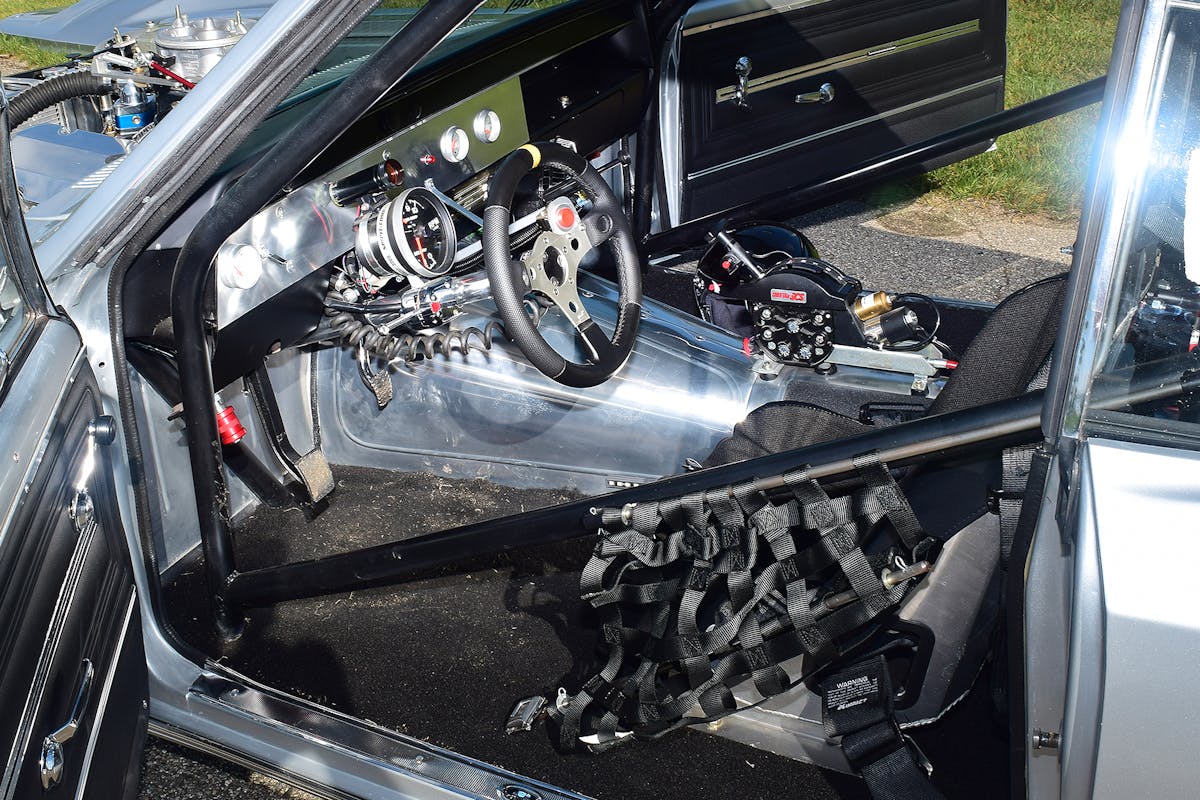 Chitwood performed all of the aluminum interior work inside the car, other than leaving the door panels factory. He installed Autometer gauges in the dashboard and added a Kirkey Racing Fabrication seat and Grant steering wheel. He exclusively uses Impact Race Products safety equipment throughout the Chevelle.