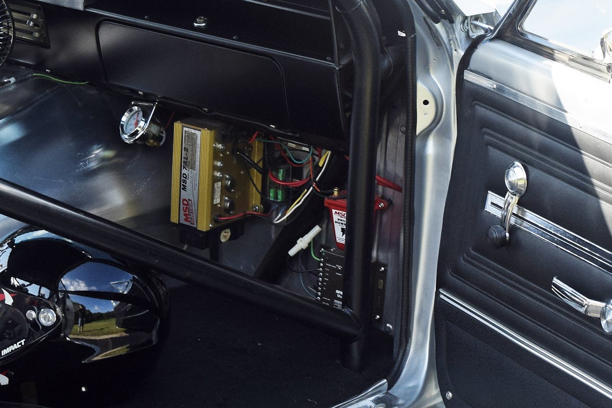 Front suspension is an A-arm assembly with QA1 coilovers. In the rear of the chassis is a four-link suspension with QA1 shocks/springs, as well. He modified a 9-inch Ford housing with 4.56 gears and all Strange Engineering spools and axles. His Jones induction is fed with an Aeromotive A2000 fuel pump and filter assembly and Holley/Earl’s Performance braided steel plumbing. Other varied hardware includes a Turbo Action Cheetah SCS shifter, General Motors 12-volt alternator, and fully operating headlights, tail lights and turn signals.