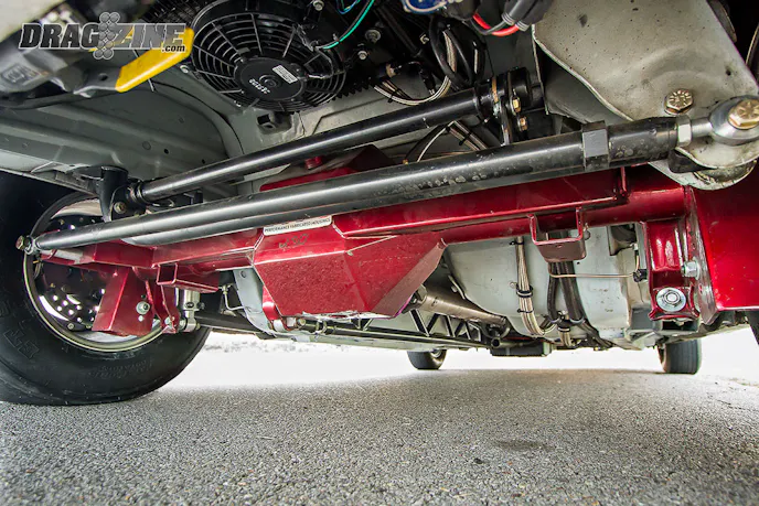 The power is transferred to the rear end through a TCI Pro-X transmission built within a Reid Racing case with a 1.80 first gear, mated to a TCI 9.5-inch, 5,000 RPM stall torque converter, cooled with a TCI trans cooler and shifted via a TCI Outlaw shifter. From there, everything is moved through an Inland Empire chromoly driveshaft to the Moser M9 race housing and Moser axles out back.