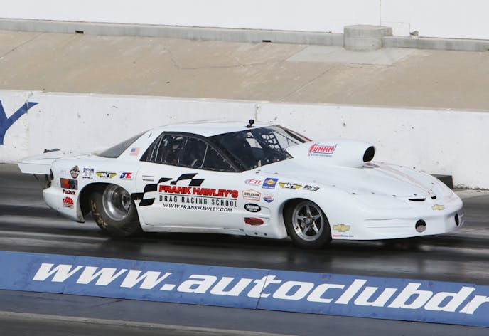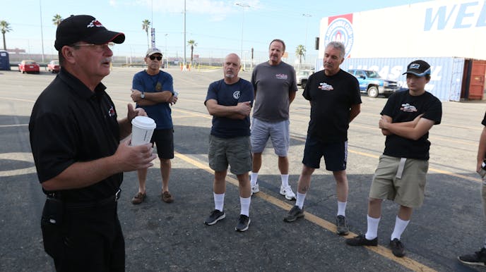 To give you an idea of what it is like to attend the Frank Hawley Drag Racing School, let’s start with my first day at Auto Club Speedway in Fontana, CA. While the school may be based out of Gainesville, FL, they like to take the show on the road (fortunately for me). I left at 5:30 a.m. as I suspect any other locals did because when I arrived two hours later the mood was light but quiet. Frank reminded us that it “wasn’t church.” We started filling out the waiver and were given a flyer for $1,000 off a Chevrolet Performance crate engine. All of the school’s cars are equipped with the ZZ572 big-block crate engine. The school sells merchandise as well as GoPro footage of the last two runs.