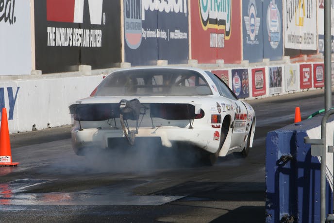 I was fourth in the run order, which gave me sufficient time to make myself nervous. The school provides the SFI suit, gloves, helmet, and head sock. Once dressed and ready to go, I climbed into the Firebird, locked the steering wheel into place, latched my harness, and put on my helmet and gloves. The instructor gave me the go-ahead to fire up the big-block as he worked the throttle. I slid the shifter into First gear and let the car idle its way forward. I gave it a little throttle as I rolled into the burnout box. The Firebirds have a 3-step rev limiter, so once into position, you click on the line lock, let go of the brake pedal and mash the throttle.