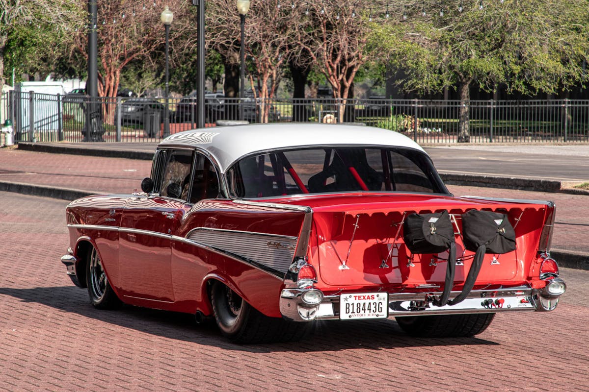 The inside, as you can see, is just as immaculate as its exterior, with factory-style door panels, Braun faux-leather bucket seats, and the original ‘57 dash with all the old-school metal push-buttons and air vents. Richardson relies on a Dakota Digital and Holley 12-inch digital dash combination to monitor all the vitals going down the road. A Richardson Boyz chrome steering wheel adds some flair, as do the carbon-fiber wheel tubs and interior panels, and the aforementioned power windows, stereo system, and air-conditioning comprise the basic creature comforts for Jerry and his wife as they cruise the boulevards in their oh-so-epic machine.