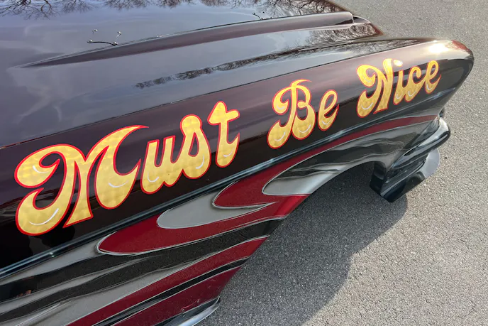 Paint and “black chrome” airbrush are created at Patch Job Garage by Misty Fields, who handled the body and prep work, with Billy Fields laying on the paint and airbrushing. Also, Pro Glass Windows lexan windshield and side glass are on the body shell.
