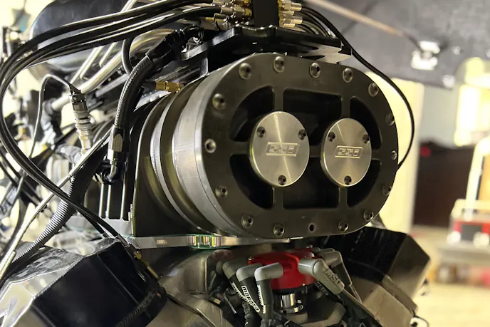 The powerplant for the emerging combination is a 541 cubic inch big-block Chevrolet iron block design Dart Machinery. An Ohio Crankshaft specialized nitro billet crankshaft, MGP aluminum rods, and JE pistons make up the lower engine. On top is a pair of Dart Pro-2 380 heads and a 14:71 SSI Supercharger Systems blower with an RCD Engineering gear drive.