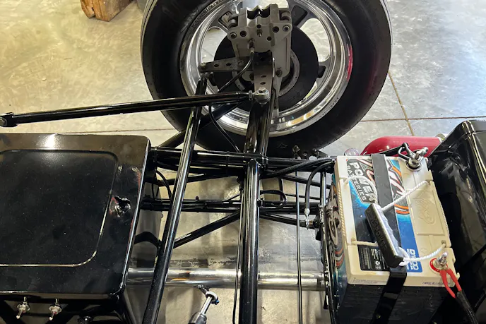 The sleeker-than-shoebox body came from the Dunn and Gone Racing mold. The shop also mounted and completed the tin work onto the ProStart Race Cars chassis. Rolling hardware includes Strange Funny Car carbon-fiber brakes, Weld Racing wheels, and Hoosier Racing tires front and back.