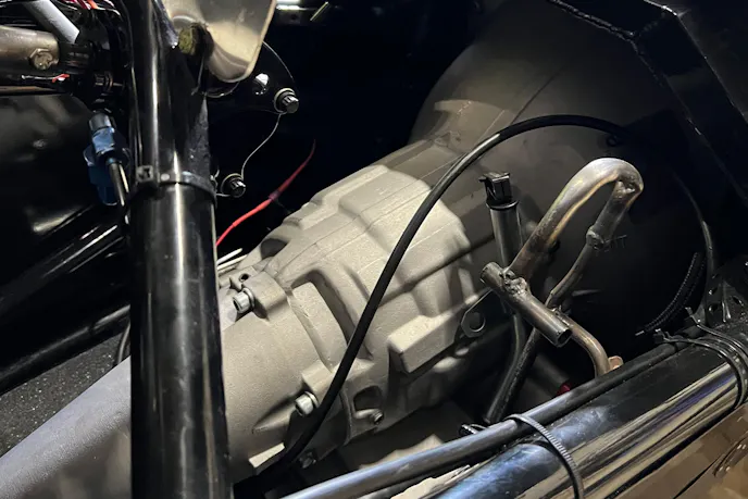The nitro-burner sits in front of a Transmission Specialties Powerglide and torque converter, with the power continuing through a Mark Williams solid-spline driveshaft and then onto a Strange Engineering 9.5-inch live axle floater rearend.