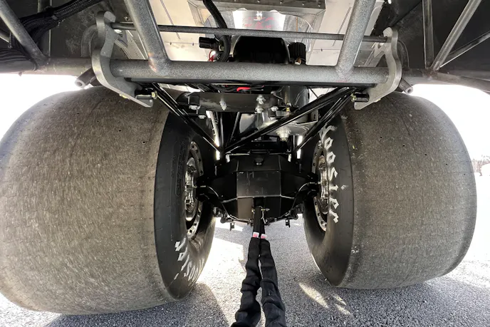 To be safe while seated behind the nitromethane-burning engine, Malott is using a Fox Fire 20-pound fire suppression system, F1ER under-body fire coating, a DJ Safety Equipment engine diaper, and an assortment of Impact Racing -20 custom fire suit, driving shoes, boot covers, head sock, helmet, and belts.