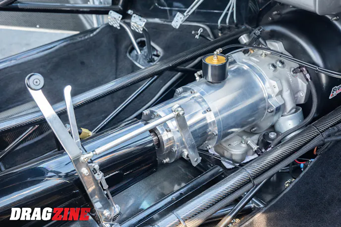 Brad Anderson also supplied the intake manifold, while Guthrie chose to stick with his longtime power adder of choice for over 20 years thanks to the support he’s received from Walt Sipp and Sergio Shifman at ProCharger. A new mounting system was needed to bolt the F-3R-136 blower on, and Mike Glickman from Blacktop Hobbies handled converting the pre-existing full exhaust system (with mufflers) to a set of racy side-exit exhausts instead. Glickman also managed fitting the oil and fuel tanks, as well as some other items.
