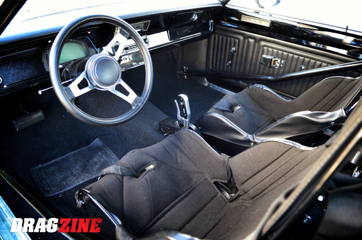 Kirkey race seats enclosed in a 10-point chrome-moly cage and a Racepak IQ3 dash, along with a TCI Outlaw shifter are blended with the brunt of the original interior, including the dash, door panels, the radio, and steering column — it even uses the original 1972 key to fire it up — and yes, even a backseat for the kiddo he has on the way, to illustrate the pro street styling in the best way possible.