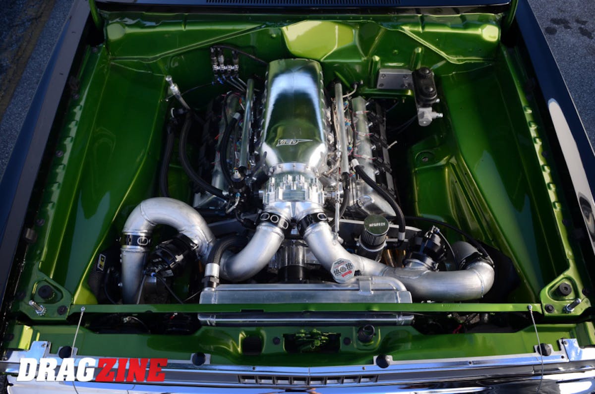 King tabbed Tony Bischoff at BES Racing Engines to assemble a 417 cubic-inch Gen III Hemi, using a G3 Performance Products aluminum block with all aftermarket rotating internals, including billet rods. Thitek cylinder heads were paired with a Visner billet aluminum Gen III Hemi intake manifold. A pair of 76mm Precision billet wheel turbos feed the beast through a cold side setup fabbed by Jeremy Howell at Fathouse Fabrications and hot side King assembled himself. A Holley Dominator EFI system manages it all, with tuning from Rick Trunkett at Big 3 Racing in Ohio.