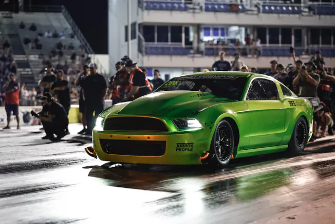 It was Lasala, however, whose story was interwoven with LaFerriere’s all weekend, who had the final laugh. Lasala’s bright “Gotta Have It Green” Mustang, built to run the popular Limited Drag Radial class, had been 5.97 at last fall’s Import vs Domestic World Cup Finals, and 3.80s in 1/8-mile class trim, and so its capabilities were well defined. Lasala was knocking on the door throughout qualifying, and Blach threw out an extra $10,00 bonus if Snot Rocket 3.0 could go sub-6.00 in Saturday evening’s final qualifier, a mark he ultimately came oh-so close to with a 6.004 at 240.91 mph, trailing only “White Rice.”