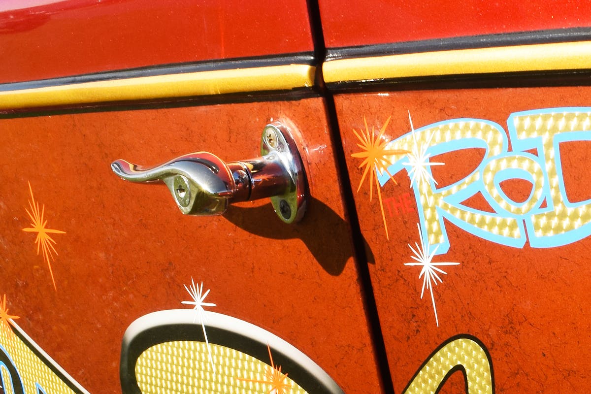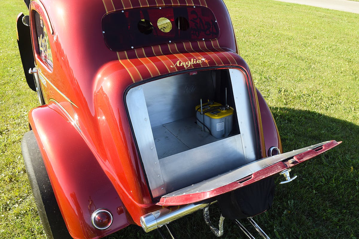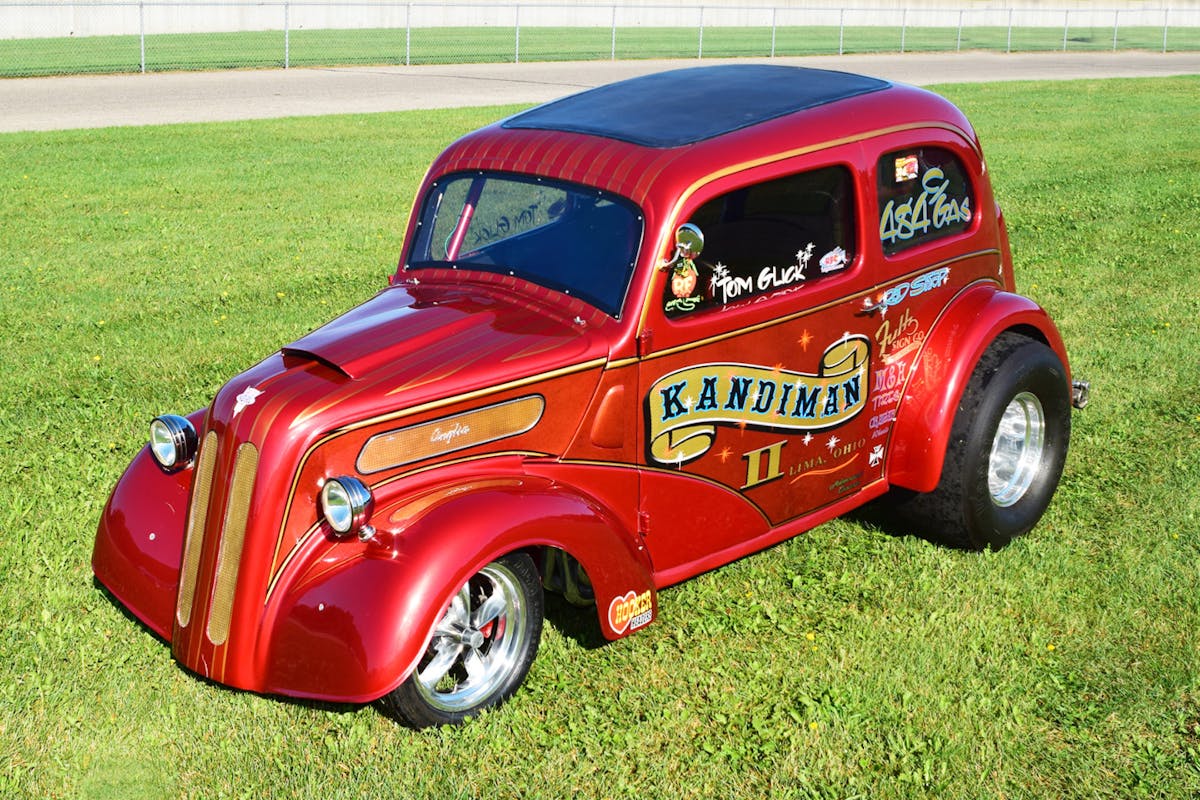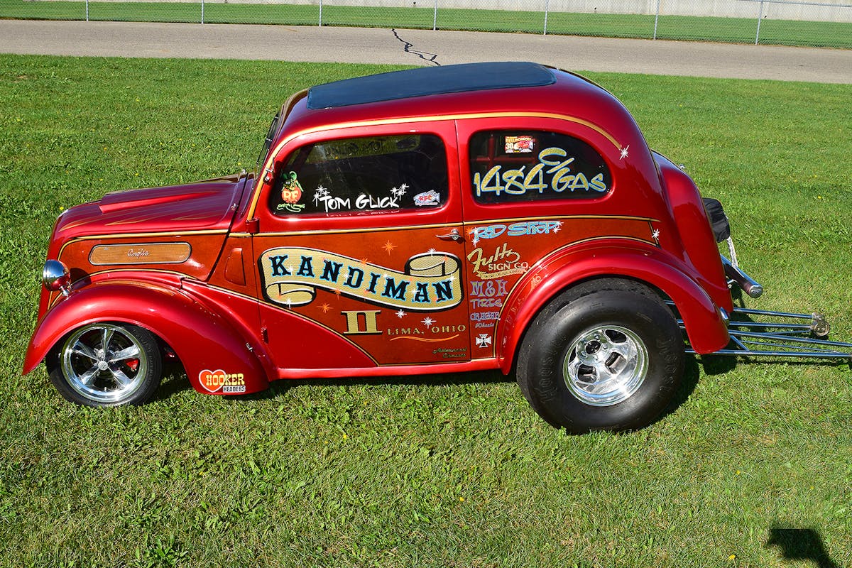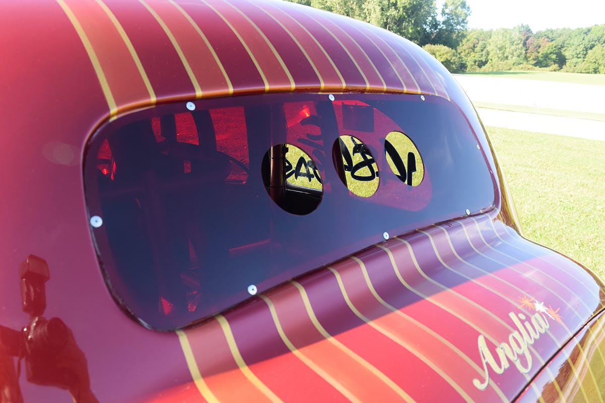 “I painted the Anglia in my own garage,” Tom says, adding “I used a Tri-coat paint process with red and tangerine accent, plus a black cob webbing effect. I want to thank Jane Glick (my wife) and Dave Mulane for their help in sanding the clear. It may not sound like much, but this kind of vintage paint scheme requires many coats and a bunch of work to get right.”
