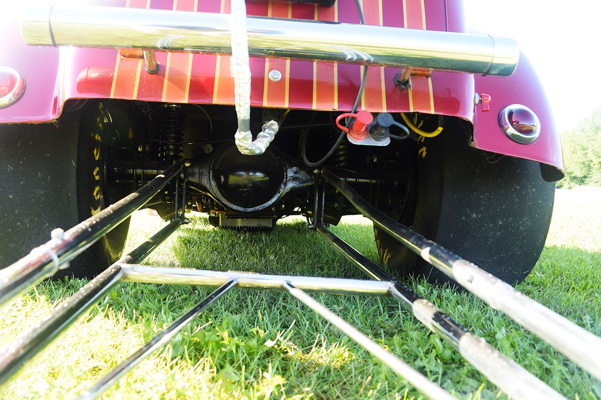 The braking duties are accomplished with Strange Engineering spindle-mount front disc brakes and stock Chrysler drum-style brakes in the rear. There is a Harwood Industries brake pedal and master cylinder assembly in place. The driveshaft is custom constructed and balanced by Lima Clutch and Joint in Lima, Ohio.