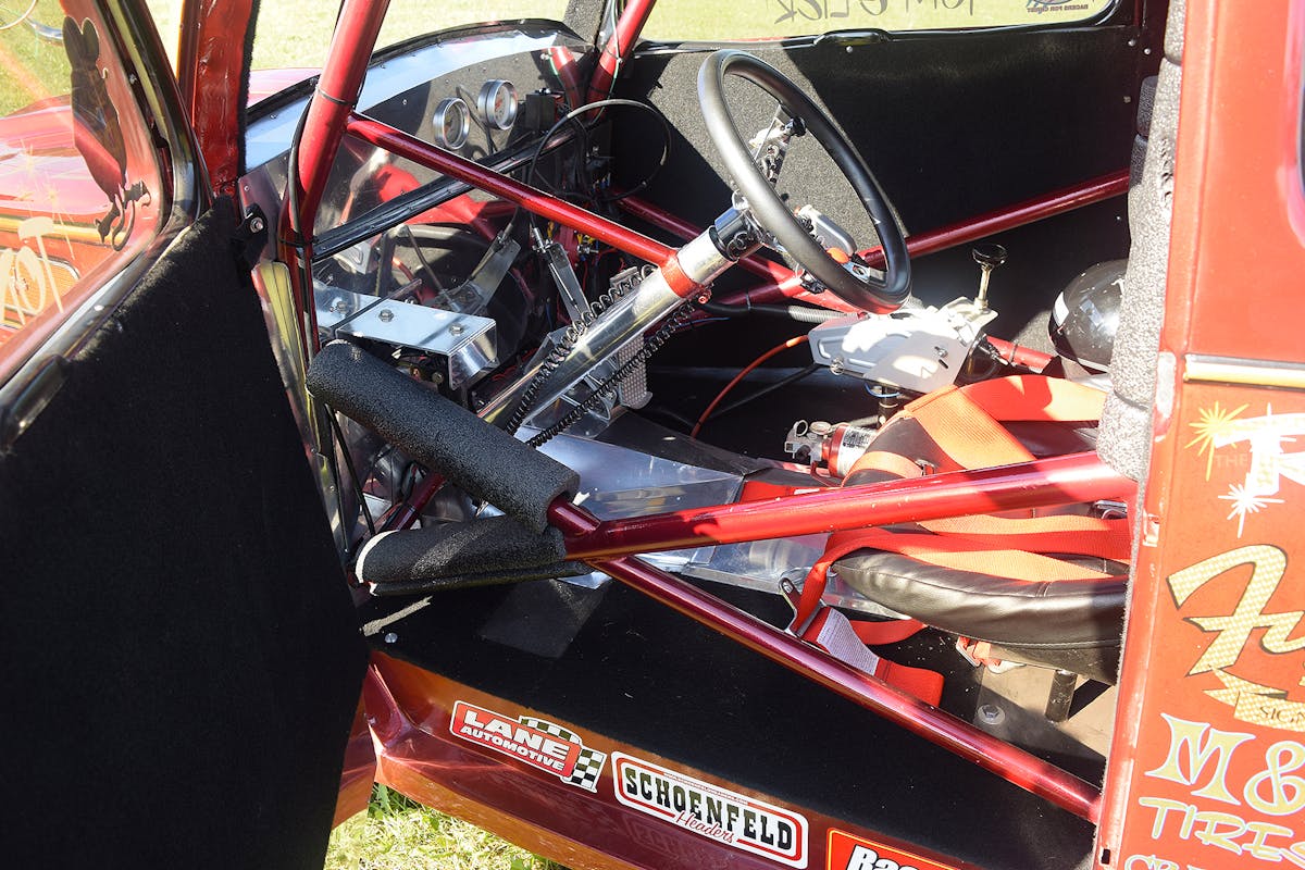 An Autometer mini tach with a magneto adapter is in the dash along with additional Autometer gauges. The one-two shift is performed with a Holley Performance/Hurst Quarter Stick. For all the safety equipment duties, Tom uses a Racequip five-point harness and all Impact Race Products helmet, jacket, and pants.