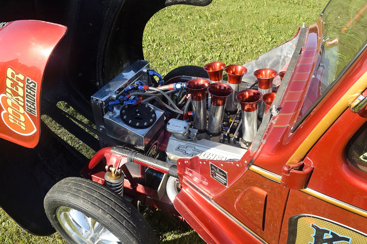 Tom took the roller and worked diligently to build his own Kandiman II creation. The body is steel with a fiberglass nose and rear fenders set of unknown origin. The chassis is constructed of 2- x 3-inch mild steel with a 12-point roll cage and Funny Car-style surround. The front suspension features a custom fabricated A-arm design beneath Strange Engineering struts.