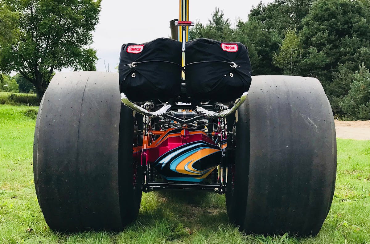 A couple of unique features in the car include a front-mounted fuel tank and a carbon fiber floor pan that lines the car forward of the driver compartment to remove air turbulence under the car. Mickey Thompson slicks and dragster front tires are riding on custom paint-matched Weld Racing Delta Wheels..