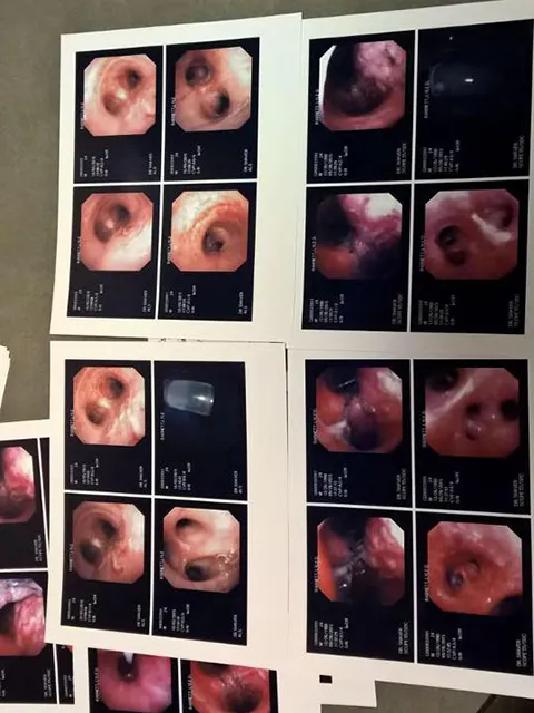Endoscope photos of Lyle's lungs. On the left, his healthy lungs following his week-long bronchial treatments. On the right, his damaged lungs immediately following the crash.