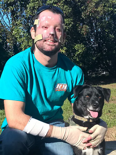 A fairly current photo of Lyle wearing a custom-fit compression mask to help with his grafts. Also pictured is Lyle’s companion and therapy dog, Nina.